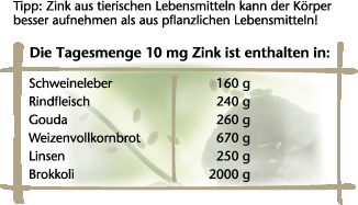 Der Mensch enthält insgesamt 2 g Zink. Etwa 70 Prozent des Zinks im menschlichen Körper befindet sich in Knochen, Haut und Haaren.