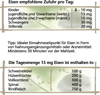 Der gesamte Eisenbestand des Menschen beträgt durchschnittlich 2 – 4 g. Die Hauptmenge des Eisens liegt im Körper als Blutfarbstoff (Hämoglobin) vor, größere Blutverluste sind daher mit Eisenverlusten verbunden.